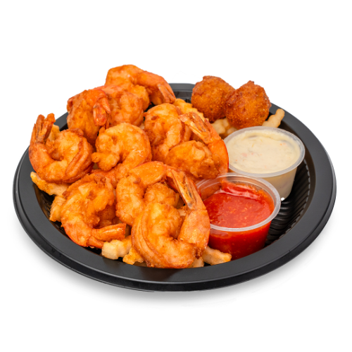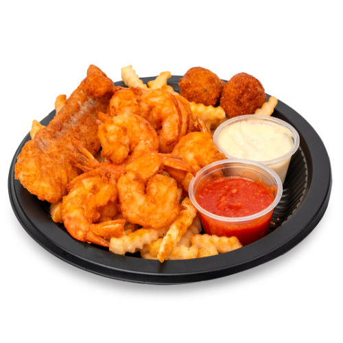 6 Fried Shimp, 1 Piece of Fried Fish, Hushpuppies & Fries served with Cocktail and Tarter Sauce