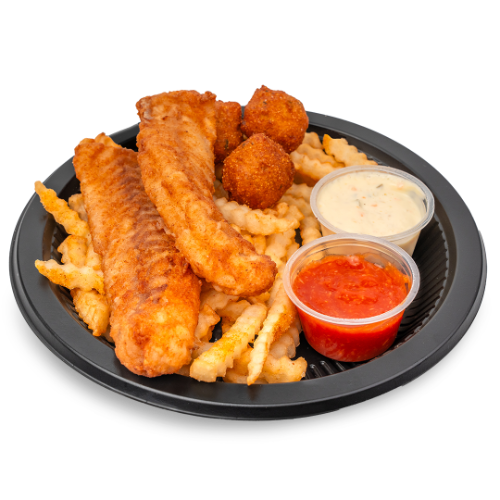 2 Pieces of Fried Fish, Hushpuppies & Fries served with Cocktail and Tarter Sauce